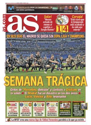 Titolo forte quello di “Marca” che scrive: “Qui giace una squadra che ha fatto la storia” inserendo la foto di uno spicchio di tribuna con il tabellone che recita il risultato finale. “As” titola invece: “Semana tragica” facendo riferimento, oltre alla sconfitta di ieri, alla doppia caduta interna nei due classici contro il Barcellona. “Nada de nada” nella prima pagina di “Mundo Deportivo“: “El Madrid cae con estrépito y consuma su gran fiasco, pierde Champions, Liga y Copa en una semana“. “Fin de un era” scrive invece “Sport“.