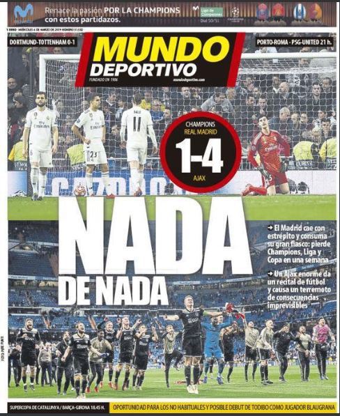 Nonostante una squadra formidabile e anni di successi, alla stampa spagnola non è andata affatto giù la pesante debacle di ieri del Real Madrid contro l’Ajax.