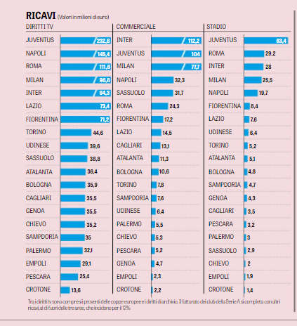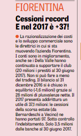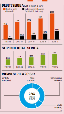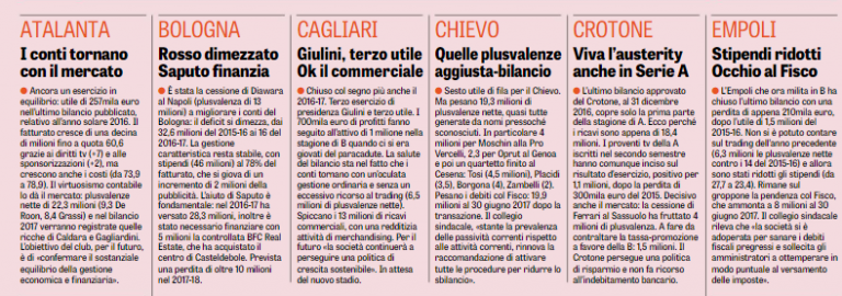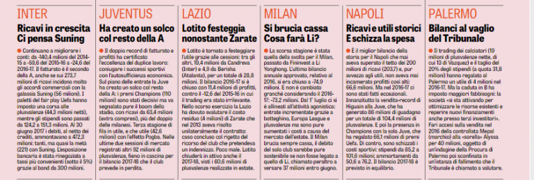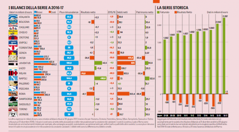 BILANCI SERIE A – Serie A, i bilanci dei club che non permettono di guardare al futuro con tranquillità, ecco l’inchiesta della ‘Gazzetta dello Sport’ che fotografa la situazione del nostro calcio. Nella scorsa stagione il risultato netto aggregato d’esercizio è stato positivo ma i debiti al netto dei crediti hanno sfondato per la prima volta il muro dei 2 miliardi. Le plusvalenze da una stagione all’altra sono raddoppiate: dai 347 milioni del 2015-16 ai 690 del 2016-17, i debiti verso le banche e gli istituti di factoring sono arrivati a 1,289 miliardi: erano 1,175 nel 2015-16 e sotto il miliardo (977 milioni) cinque anni fa. Occhio alle pendenze con il Fisco, il Chievo ha sul groppone quasi 20 milioni, l’Udinese ha appena transato per 11,7 milioni, il Genoa sta pagando una pesantissima rateizzazione tra Iva e Irap pregresse, il cui residuo è poco meno di 60 milioni. Ricchi profitti per le prime della classe: +66,6 milioni il Napoli, +42,6 la Juve, grazie alle plusvalenze e ai premi Champions. Fondamentale sfruttare il vivaio, in questo senso Atalanta e Sampdoria sono un passo avanti, le conduzioni più equilibrate sono quelle di Torino, Cagliari e Crotone, unite società a non ricorrere al credito bancario. In alto la fotogallery con la situazione nel dettaglio.