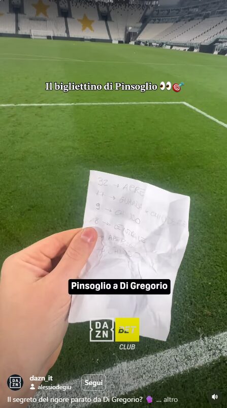 Il gesto è furtivo, puramente scolastico. Di Gregorio apre il foglietto, lo legge in un secondo — c’era scritto “Aperto”, riferendosi alla tendenza di Martin di aprire il piattone sinistro — e poi, per non farsi scoprire dal “professore” (l’arbitro Massa), lo lancia con noncuranza per terra. Pochi istanti dopo, la magia: Martin calcia proprio dove indicato, Di Gregorio vola e respinge il tiro e anche la ribattuta. Il rigore è parato, il risultato è salvo e Pinsoglio corre a recuperare il bigliettino da terra come se dovesse nascondere le prove di un’infrazione.