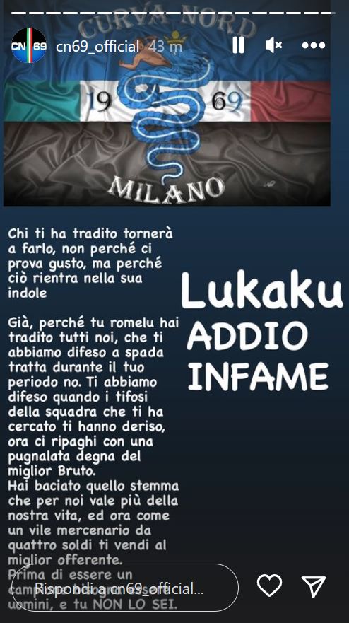 Ora ci ripaghi con una pugnalata degna del miglior Bruto. Hai baciato quello stemma che per noi vale più della nostra vita e ora come un vile mercenario da quattro soldi ti vendi al miglior offerente. Prima di essere campioni bisogna essere uomini e tu non lo sei. Lukaku, addio infame”.