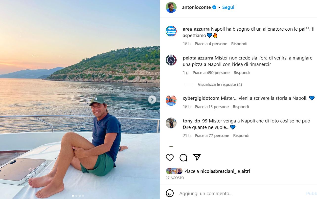 Antonio Conte non è molto atttivo sui social e l’ultima foto risale ad agosto alle vacanze in Croazia. I tifosi del Napoli hanno preso d’assalto proprio il vecchio post: “Napoli ha bisogno di un allenatore con le pal**, ti aspettiamo”, “Mister non crede sia l’ora di venirsi a mangiare una pizza a Napoli con l’idea di rimanerci?”, “Mister… vieni a scrivere la storia a Napoli”, “Mister venga a Napoli che di foto così se ne può fare quante ne vuole…”, “un popolo intero l’aspetta”.