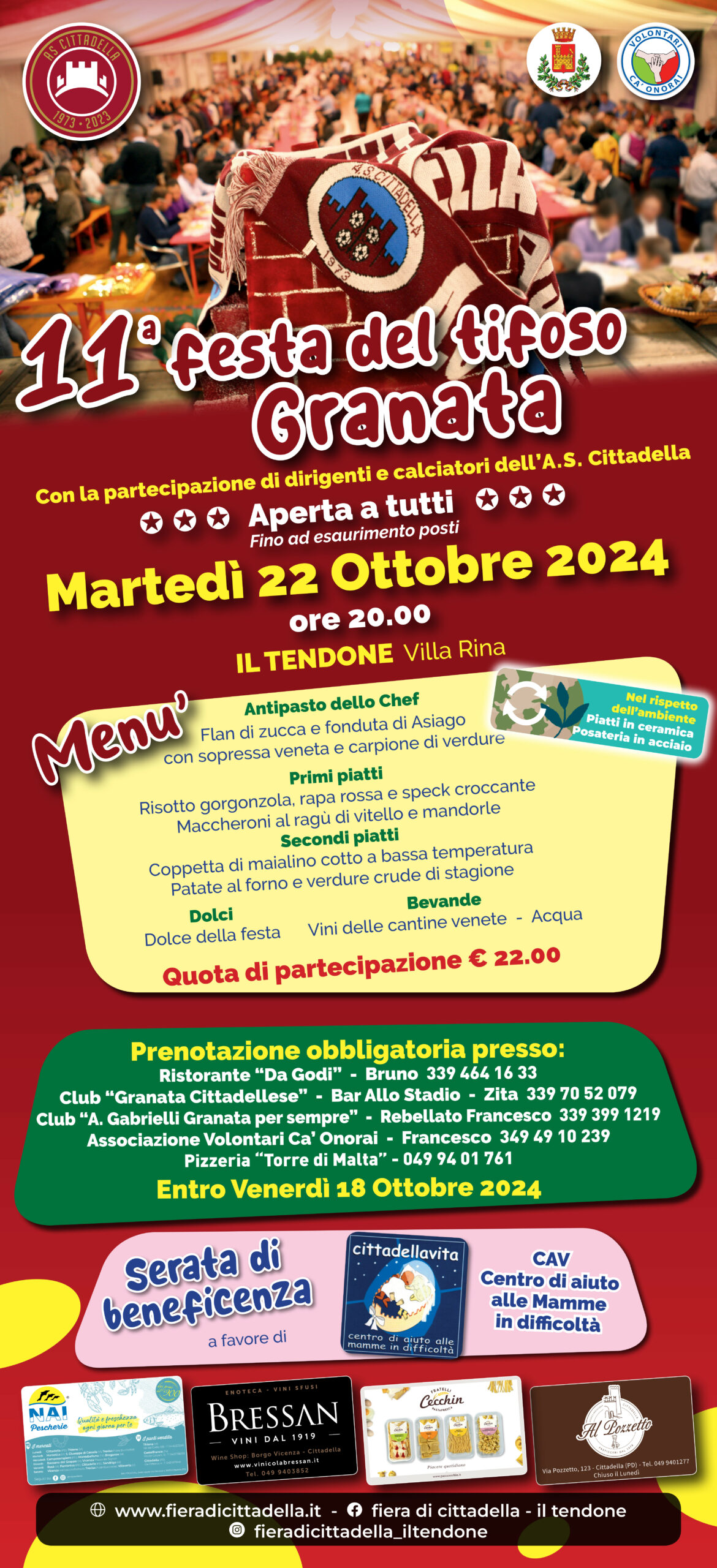 “Torna l’appuntamento in occasione della Fiera Franca a Cittadella, la FESTA DEL TIFOSO GRANATA! In collaborazione con i Volontari di Ca’ Onorai, il Comune di Cittadella e tutti i club granata.